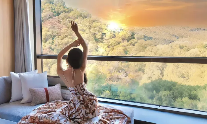 位于酒店中高层,约57平米客房配置一张1.8米宽的大床和一张1.5米宽大床,两床均配有高级床垫与亲肤纯棉床品,确保每位宾客都能享受到高质量的睡眠体验。无论是举家出行的亲子时光还是三五好友间的欢聚小住,都能找到各自理想的休憩空间。独立浴缸及步入式淋浴间,Nespresso胶囊咖啡机等现代化设施,现代中式与在地文化相融合的设计相得益彰,通过全景落地窗可赏石景山的翠微景致,是宾客商旅出行、亦或家庭出游、好友相聚尽享娱乐、休闲和度假时光的又一选择。
